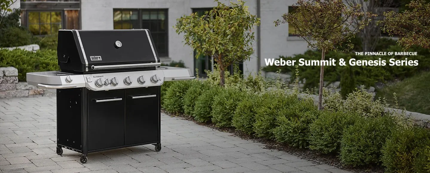 The Weber Summit 470 Series are a large four burner barbecue with a side burner, a smoker box with its own individual burner, a sear station and a rotisserie with an infrared burner. Available in black porcelain enamel or stainless steel.